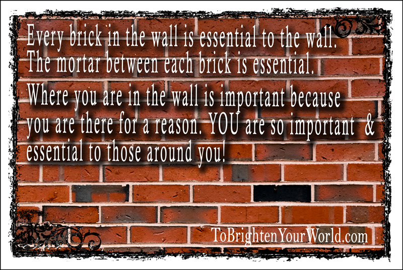 You’re not just another brick in the wall. You are very important to the wall and to those around you. If you weren’t there where you are supposed to be, there would be a hole in the wall. If another decided to move too then there would be more holes in the wall. Eventually there wouldn’t be a wall. You are important and you are loved.