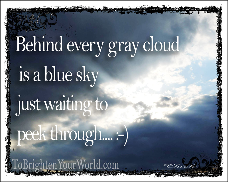 Is the sky over your head a bit gray? Does it look like rain? Remember that above the clouds is ALWAYS a blue sky! Why let a little patch of cloud block the sun for you? Make your own sun! Make your own bright and sunny day with your positive attitude. Bring the sun into the lives of those you come in contact with today. You never know how a kind word or a smile may have a positive effect someone. Don’t risk it, bring the sun with you. And SHINE On 🙂