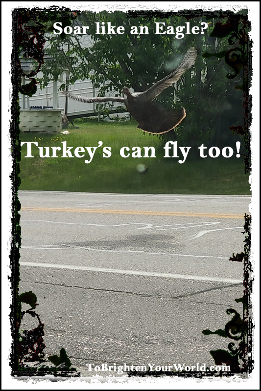 Who says you have to Soar like an Eagle? Not everyone is an Eagle. Some of us are Turkeys! Turkeys can fly too. If the world were all Eagles who would you invite for dinner at Thanksgiving? Ever heard of an Eagle being invited for dinner, No? But I digress…. FLY! Why? Because you CAN!